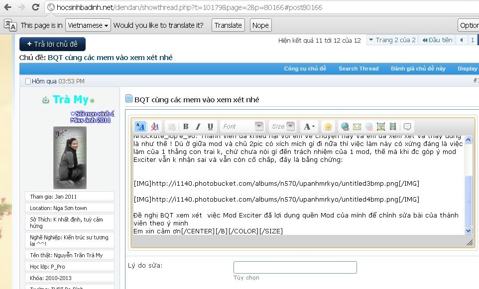 Ừ thì công nhận là mod không cố tình lạm dụng chức quyền để làm việc tư đi, vậy còn cái trách nhiệm làm mod để ở đâu khi có những liên tiếp sự nhầm lẫn không đáng có như thế này. Và tại sao lại chỉ xin lỗi mình nhóckute_lop’e_96 còn cái người trực tiếp là nạn nhân của sự nhầm lẫn thiếu trách nhiệm này lại không đc xin lỗi. Còn về cái việc em bảo mod không xứng đáng là thằng con trai thì em xin lỗi vì em không biết mod chỉ “nhầm lẫn” thôi. CHứ nếu quả thật là sửa lại bài của mem khác để giải quyết ân oán cá nhân thì quả thực con gái cũng chỉ đứa nào bỉ ổi, đê tiện lắm mới làm thôi mod ạ. Và mod bảo khôg để ý em nói về vấn đề này thì mod xem lại nhé, khi gửi tin nhắn cho mod, e đã ghi rõ ràng là mod xem lại bài viết của NHóckute_lop’e_96 rồi, còn có cả links nữa mà
